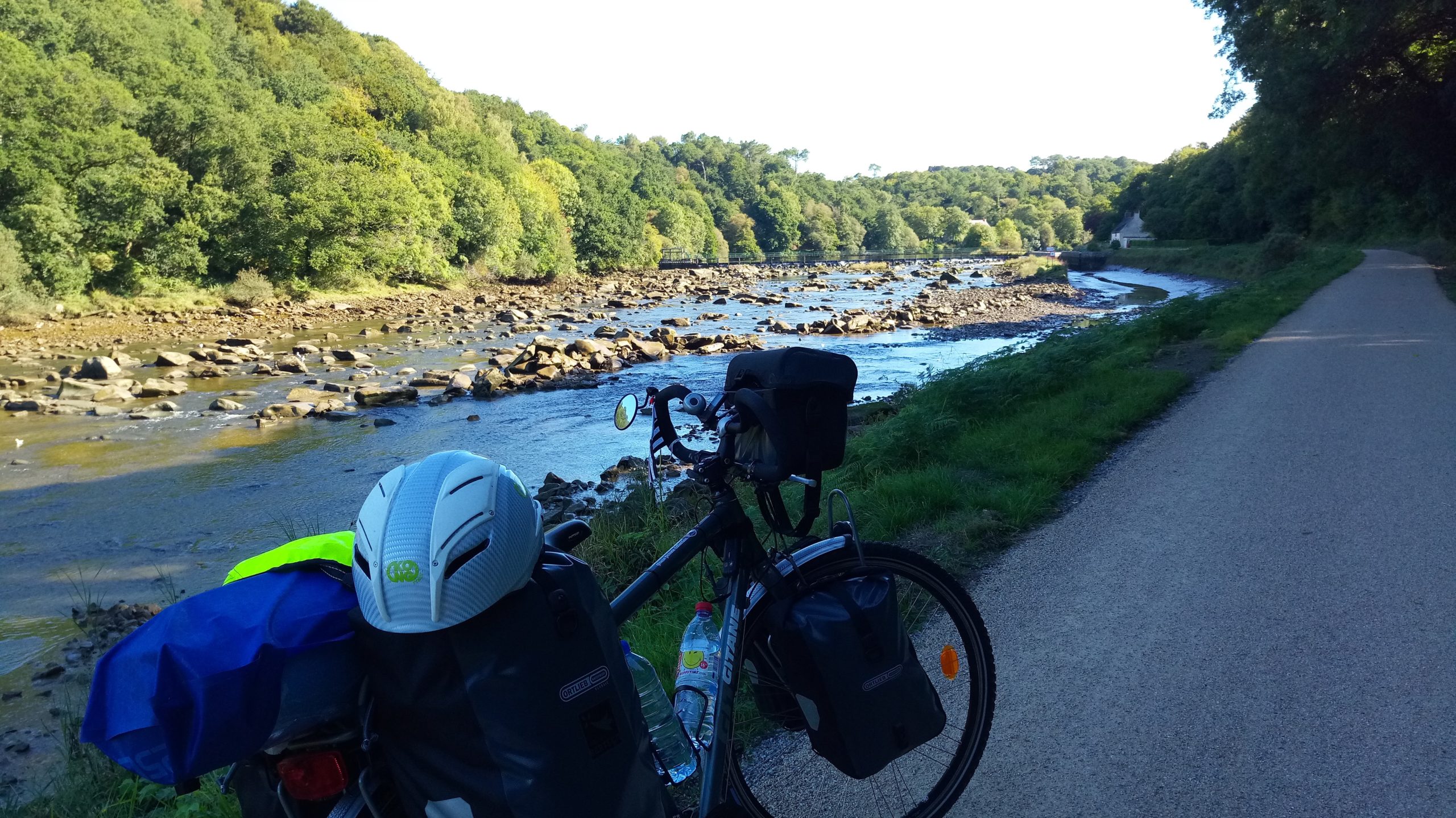 Ça y est c’est le jour J, le départ du voyage que l’on prépare sur le papier mais surtout dans la tête. Premier grand voyage à vélo en autonomie (relative). Je vais découvrir jour après jour ce que j’ai jusqu’à maintenant surtout lu dans des magazines: mon préféré étant Carnets d’Aventures. J’y suis abonné depuis le n°1 et je rêve à l’idée de partir avec mon vélo, ma tente et ma popote … Ce n’est plus un rêve, le vélo est prêt. Je pense que j’ai tout ce qu’il me faut, sûrement trop. La 1ère partie du parcours le long du Blavet et du canal de Nantes à Brest, je la connais bien. Donc je ne serai pas trop dépaysé, je vais pouvoir me concentrer sur l’organisation de mon matériel, son utilisation et voir si ma forme physique est au rendez-vous. Je m’attends à souffrir un peu car ce sont les 5 premiers jours les plus durs et j’ai rarement dépassé ce nombre, normalement à partir du 6ème jour c’est le bonheur !