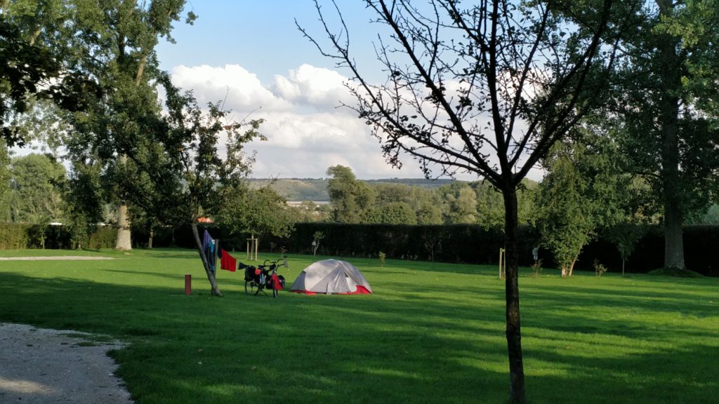 Ce matin camping « basket » comme on dit … personne à l’accueil, pas un chat … je pars sans payer mais sans remords. Il fait beau, le vent est favorable, la piste cyclable est belle mais en bordure de route donc un peu bruyante, c’est joli, les villages sont un peu vides. Après une zone plate pour s’échauffer j’attaque « Le Boulonnais » en bifurquant ‘nordet’ , malgré les bonnes cuisses à J13 ça grimpe quand même. Je trouve un beau camping avec zone tente, je suis tout seul: ce soir piscine, bière et resto en terrasse après les tâches primaires: douche, rasage, lavage du linge … le bonheur.