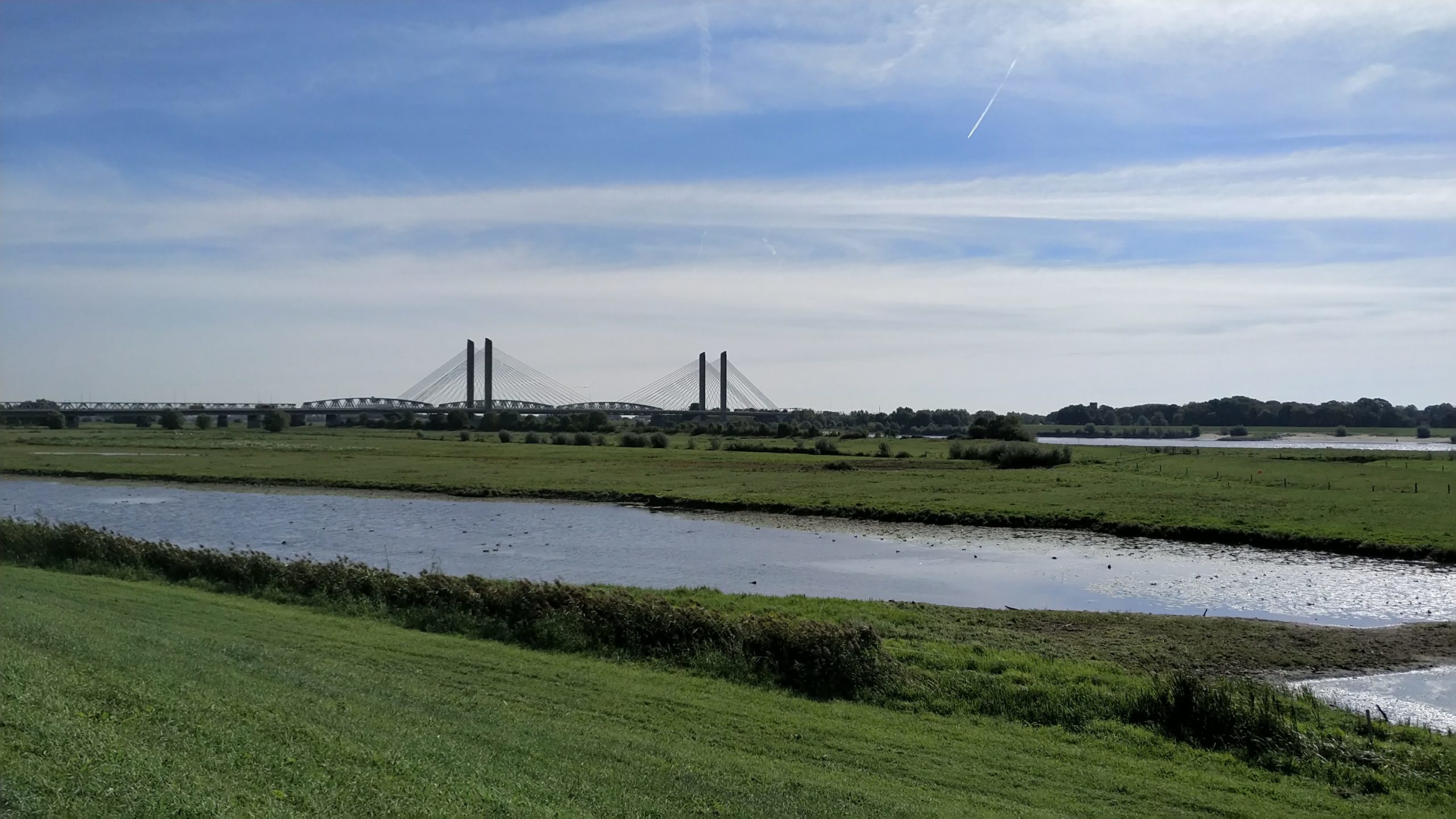 Temps magnifique au lever du soleil, réveillé par les vaches d’une gigantesque ferme de l’autre côté du canal. Des pistes cyclables à n’en plus finir, bien entretenue et dans des paysages magnifiques … un peu plat à mon goût mais avec le vent 3/4 arrière c’est pas mal, c’est reposant. Quelques kilomètres après le départ, je rejoins les rives du Rhin (Rijn en NL), il faut savoir que le fleuve se sépare en de multiples bras sur 100kms avant de rejoindre la mer, et d’autres rivières viennent se jeter à leur tour dans chaque bras, dont La Meuse (que je ferais un jour) dans le bras sud… compliqué le réseau fluvial néerlandais mais parfaitement maîtrisé. Le long du Rhin c’est un peu monotone, on vit au rythme du trafic fluvial impressionnant. Les berges sont le siège de gigantesques industries. Difficile de trouver un camping donc je m’éloigne vers une forêt et trouve un beau bivouac calme.
