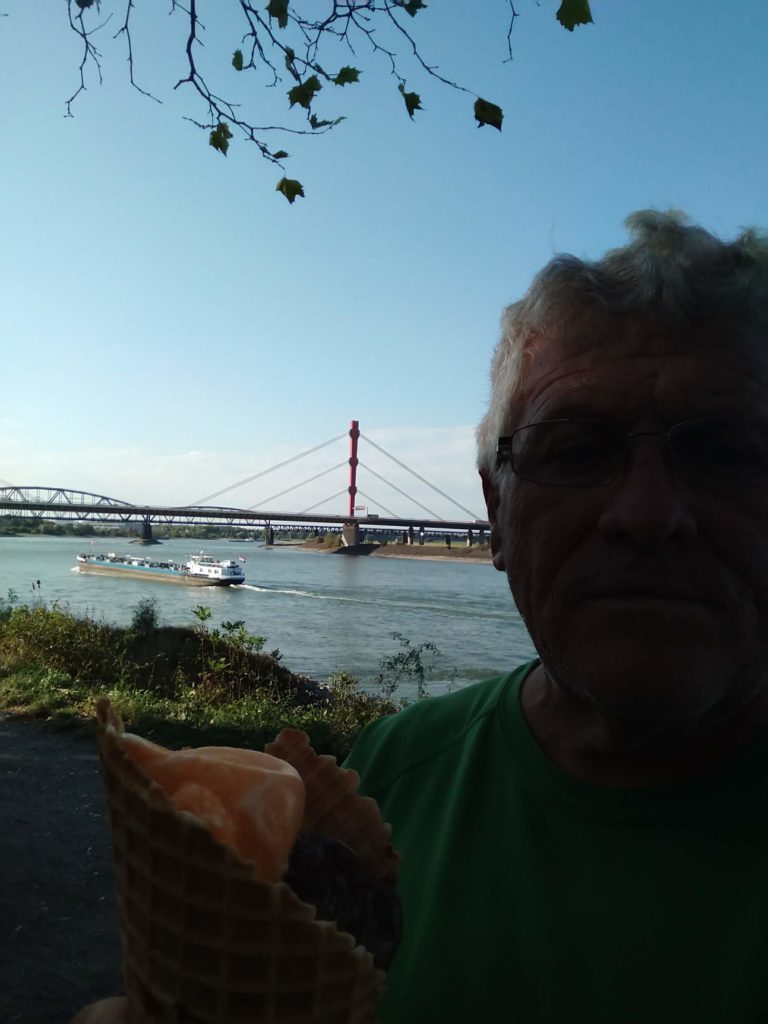 Je sors de la forêt par un chemin de 10 kms, mon GPS ne fonctionne pas bien, je roule plein est pour rejoindre le Rhin qui oblique vers le sud donc … dommage que je ne puisse pas ramener quelques belles citrouilles, la dame m’en donne une petite pour me faire une soupe ! j’en ai fait une bonne purée le soir même. Je rejoins le Rhin, belles pistes le long du halage avec vent pleine face, il fait très chaud 32°, je vais boire 7 litres à cette étape … la petite glace servie par un italien dans son super camion est somptueuse, je suis fatigué. Je suis obligé de traverser de vastes et horribles zones industrielles implantées le long du fleuve avant et après chaque ville, c’est pas terrible, j’attends avec hâte de bifurquer le long de La Moselle.